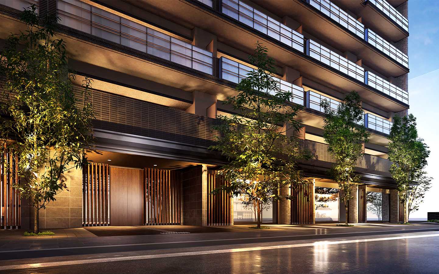 ※掲載の完成予想CGは、計画段階の図面を基に描いたもので、外観・外構・植栽・仕上げ等は実際とは異なる場合があります。外観形状の細部や設備機器等は表現されておりません。またタイルや各種部材の質感や色等は実際とは異なります。行政指導及び施工上の理由等のため、今後変更となる場合があります。敷地内の植栽は育成に必要な環境の下で、竣工から一定期間を経た状態のものを想定して描いており、特定の季節を表したものではありません 。建設地周辺の建物や電柱等については、白線等で表現している部分がございます。周辺環境や景観は将来に渡り保証されるものではありません。予めご了承ください。
